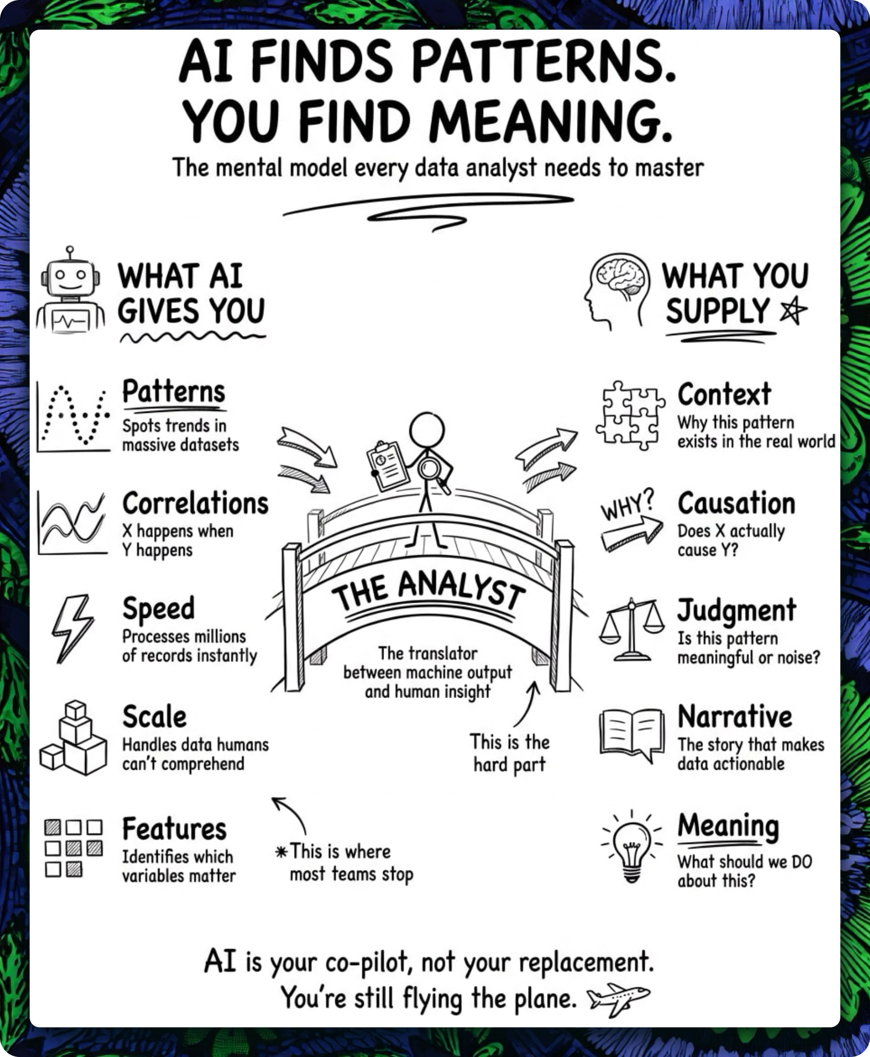 Your job as the analyst is to be the quality gate between the model’s output and the story that reaches leadership. That means interrogating every feature, every input, every assumption before you trust the result.