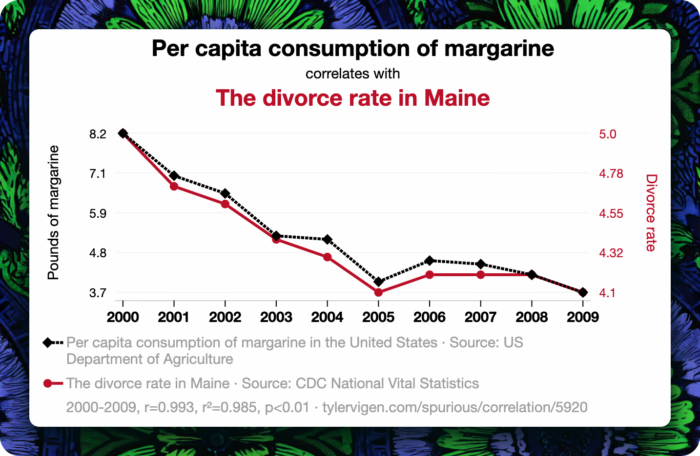 Would this relationship hold in a different time period? If the correlation only exists in the specific window I’m looking at, that’s a red flag. (This is exactly what the margarine/divorce example illustrates. Zoom out, and the relationship disappears.)